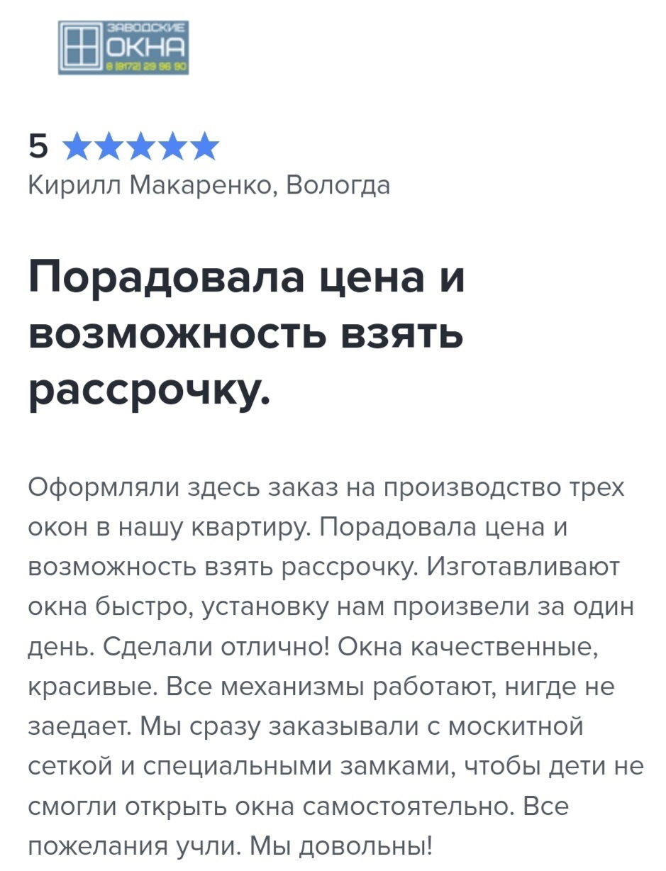 Компания "Заводские окна" основана 2011 году. Мы осуществляем поставку современных ПВХ‑изделий заводского производства и выполняем профессиональный монтаж в Вологде, с лучшим сочетанием цены и качества.