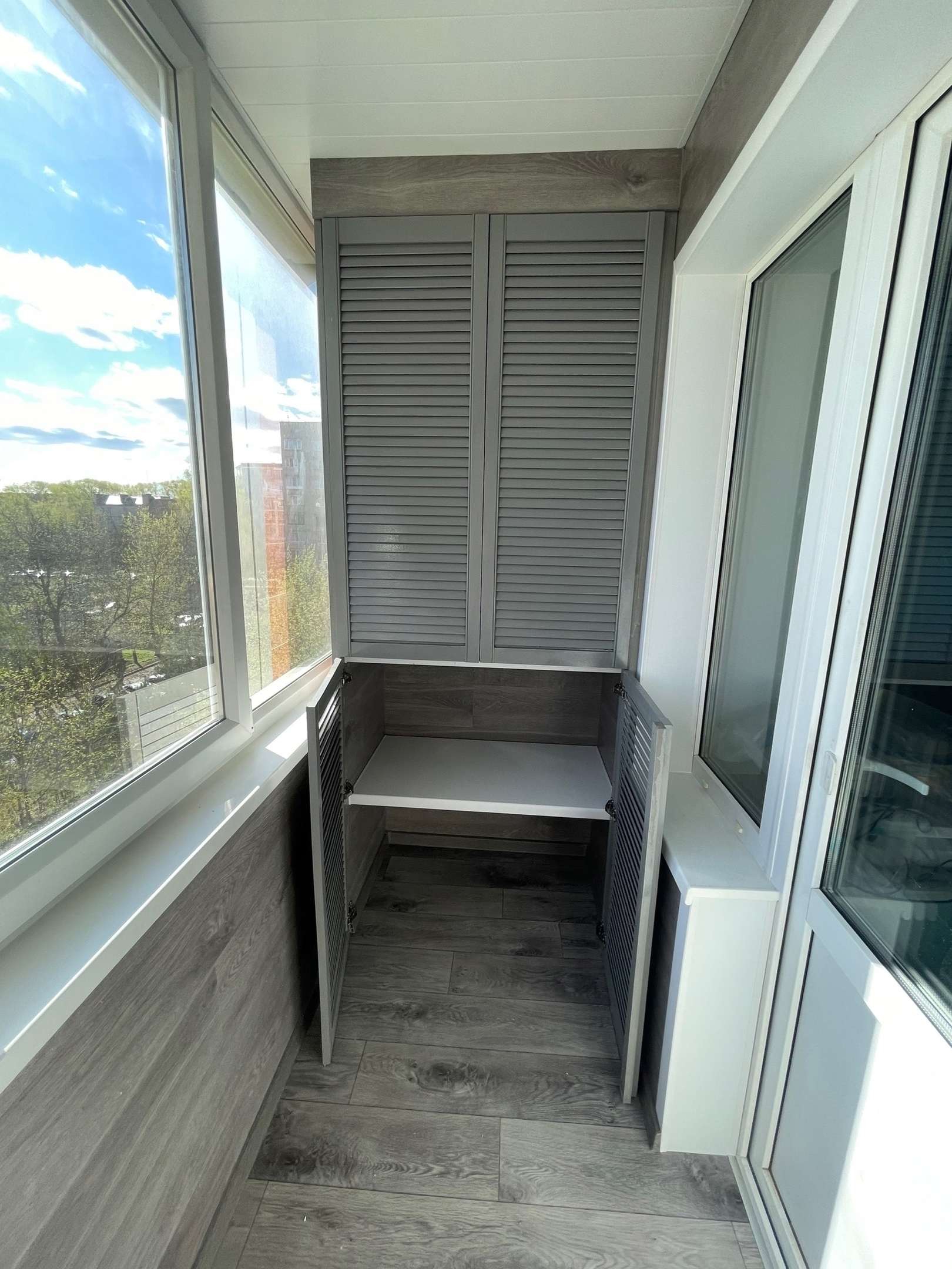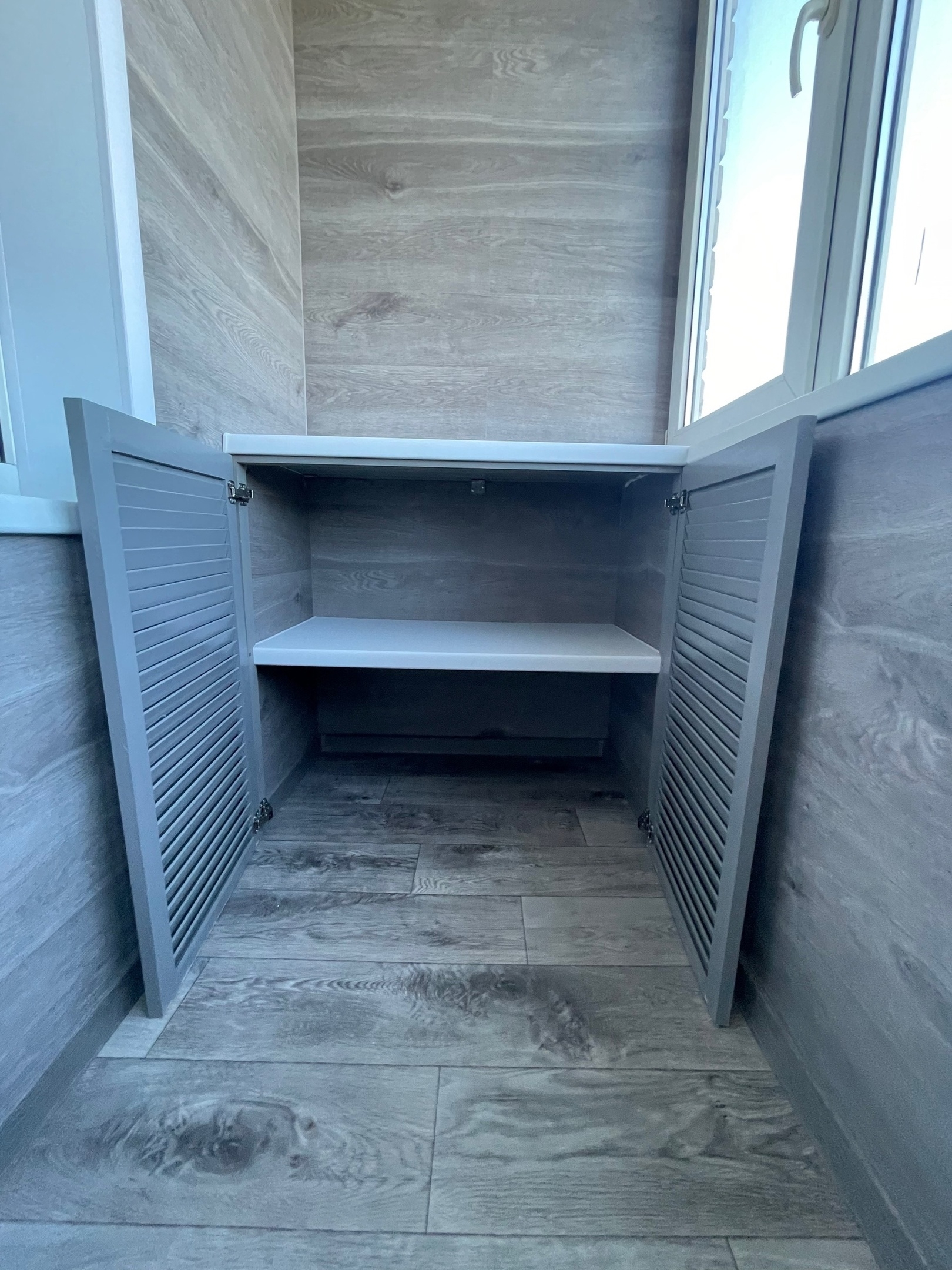 - Шкафы с жалюзийными дверями — стильные и практичные, обеспечивающие естественную вентиляцию. Отлично смотрятся в интерьерах в стиле лофт.